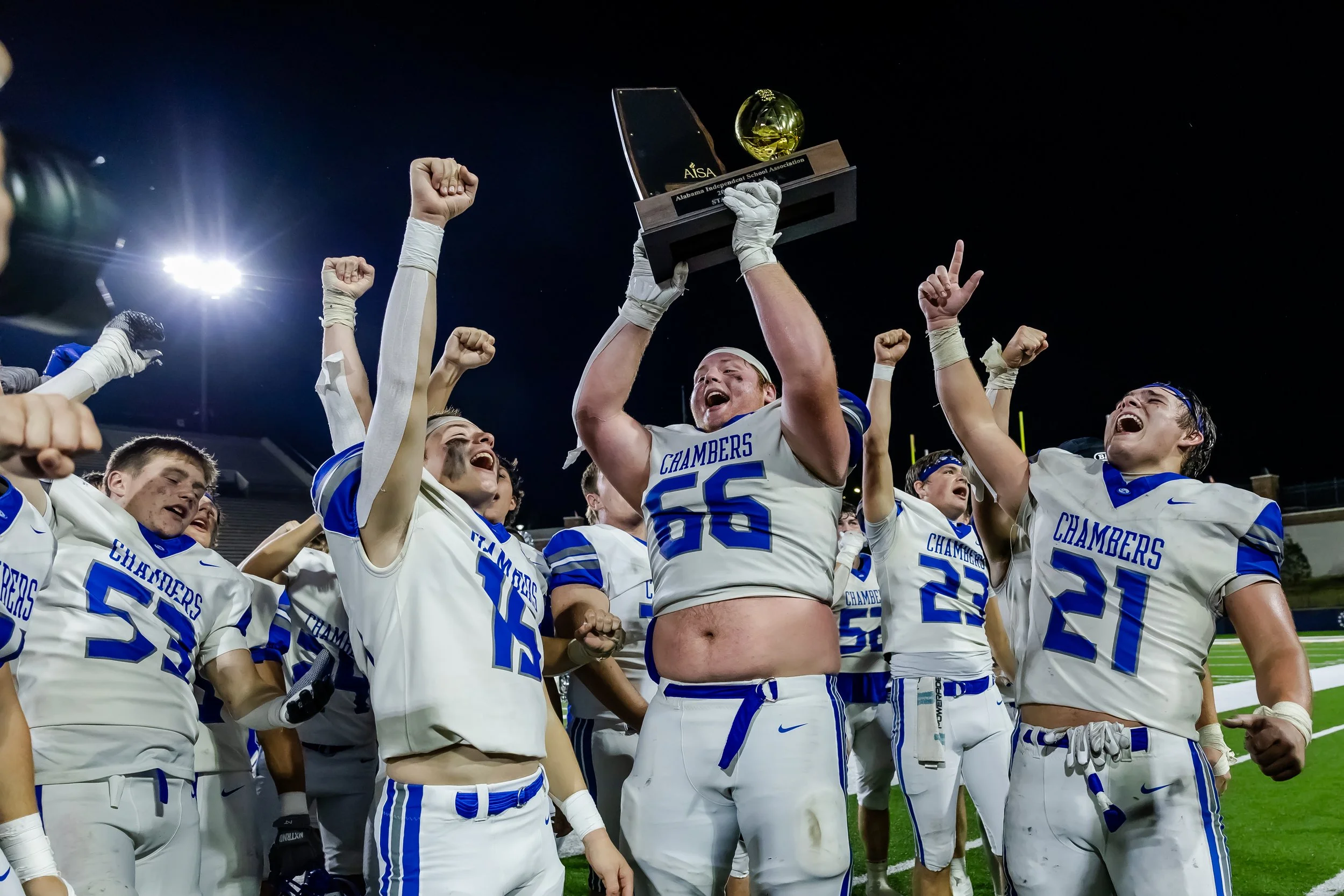 “It wasn’t easy, but our guys found a way,” head coach Jason Allen said. “We played great defense, didn’t turn it over and did enough on offense to win the game. I told our team at halftime that I was putting it in their hands to win the game upfront, and we were dominant in the second half. We were able to run the ball right at them, and at the same time, they couldn’t run it at us. That’s won a lot of games for us over the years. This will go down as one of the most dominant line-of-scrimmage teams we’ve ever had here at Chambers Academy, and they were at their finest on the biggest stage.”